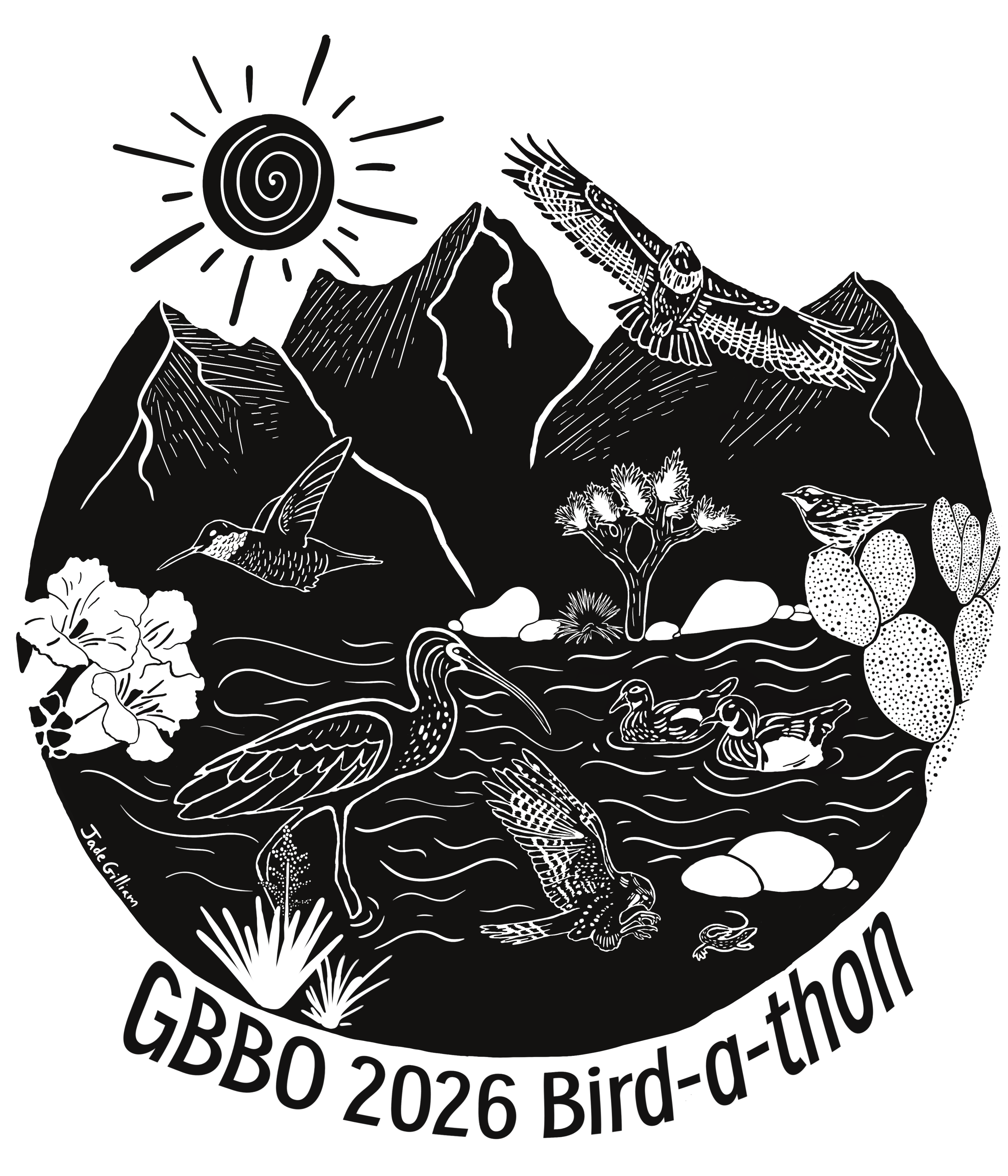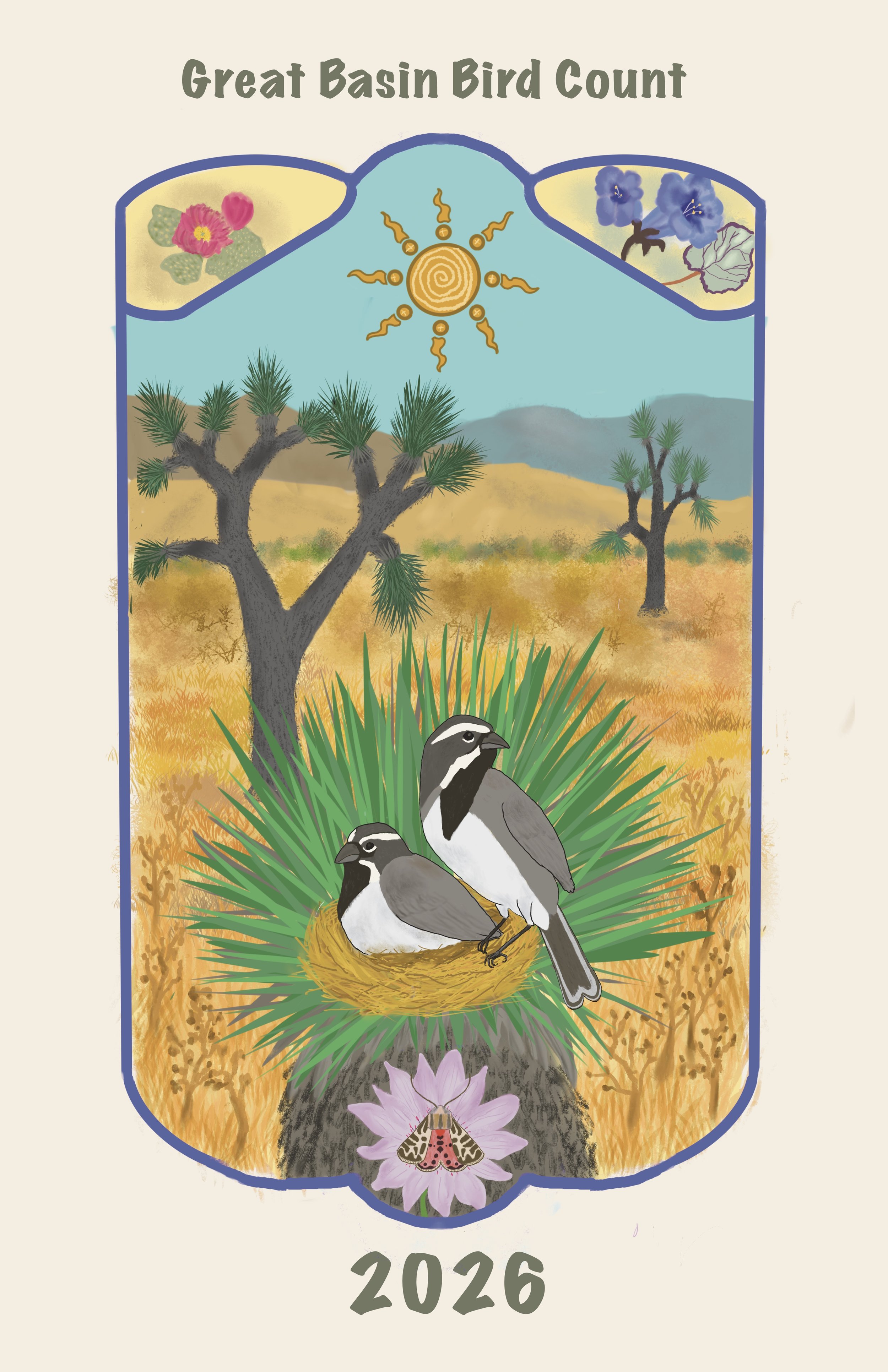 My name is Jade Gilliam, and I am an early-career biologist with a passion for scientific illustration and wildlife art. I moved to Las Vegas, NV, from Alabama last year and have fallen in love with the vast array of unique ecosystems here. To reflect that diversity, I included a few of my favorite species that inhabit different biomes across Nevada. In light of water scarcity, I wanted to not only showcase desert beauty but also highlight the life-giving water systems that keep our Silver State thriving. For the style of the piece, I imitated linocut printmaking using my iPad and Procreate (drawing software)."